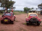 The red? one used to be raced around the condobolin/cowra area, it was road registered, has 4 wheel disc brakes, roll cage, ball joint front, 1900?cc engine! A farmer had bought it for a shooting wagon, hence the hole in the roof.