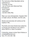 Re: The late Bob Stansfield. Thank you to all those attended to celebrate his life and memories. The memories (and stories) in the room were coming from all. He would have had a tear in his eye, and been humbled by the attendance. He was the linchpin to many people. In the Army, Off-road, Motorcycle club, family and friends he will be a legend that will be remembered. We will miss many things and have some great personal memories, but most of all we will miss his big heart, huge soul and his voice. The real Bob behind the voice will not be forgotten. He will be happy telling his stories, to his old friends ‘up there’. Smoking, drinking rum, eating a hamburger with hot chips and may be a strawberry milkshake with his dogs by his side. Thank you all If you did not get the chance to write in the Memory book, please email any storey, memory or recollection you have to Gavin Mickle. micklefab@hotmail.com Gavin and Megan Mickle, Terry and Lynne Spinks, Paul and Fran Knott.
